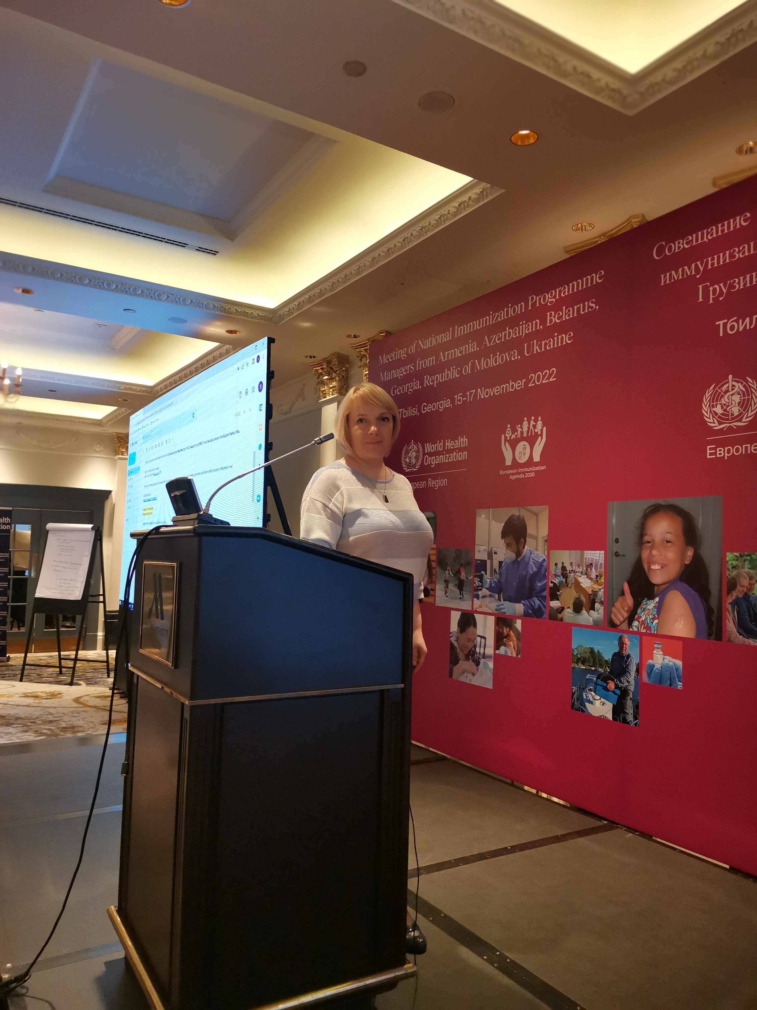 Veronika Vysotskaya, Head of the Epidemiology Department at the Republican Center for Hygiene, Epidemiology, and Public Health in Belarus, delivers a presentation at the WHO Immunization Programme Managers Meeting in Tbilisi, Georgia, from 15-17 November 2022.