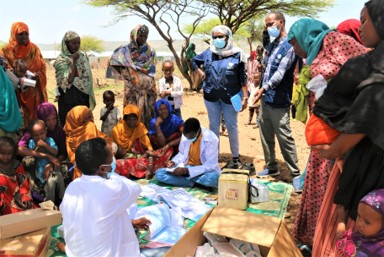 Photo caption: A WHO-supported Mobile Health Team in Fafa, in the Somali Region of Ethiopia, receives a visit from the Health Cluster and Incident Management team during drought response efforts in 2022.
