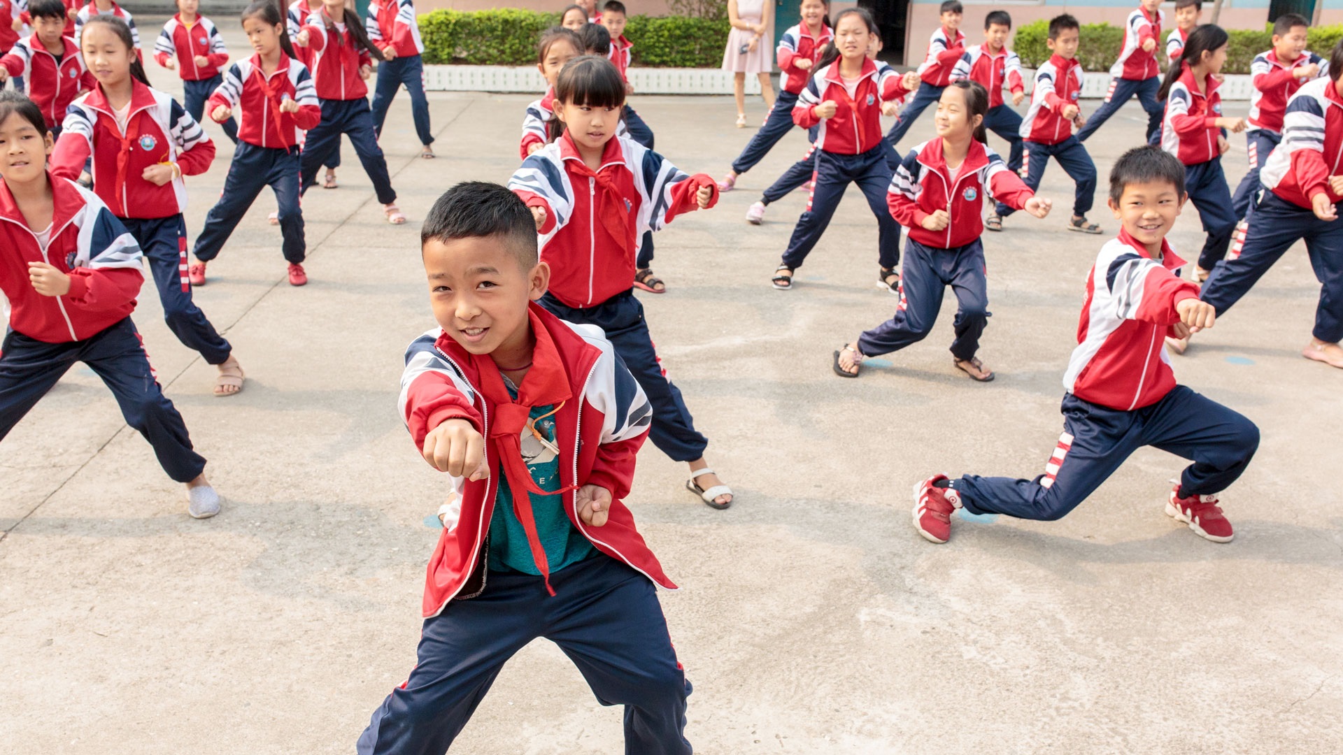 Students at the Friendship Primary School take an exercise break in the day, in Daluo Township, Meng Hai County, Yunnan. April 2019.