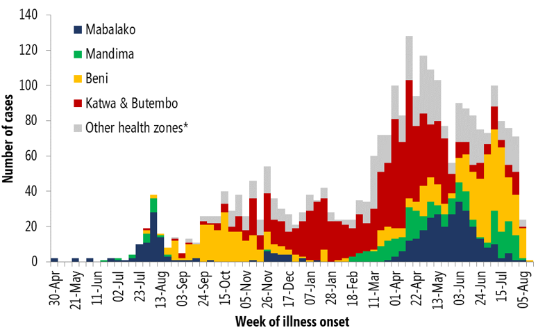 *Data in recent weeks are subject to delays in case confirmation and reporting, as well as ongoing data cleaning. Other health zones include: Alimbongo, Ariwara, Biena, Bunia, Goma, Kalunguta, Kayna, Komanda, Kyondo, Lolwa, Lubero, Mambasa, Manguredjipa, Masereka, Musienene, Mutwanga, Nyankunde, Nyiragongo, Oicha, Rwampara, Tchomia, and Vuhovi.