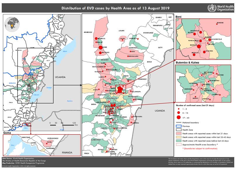 In the 21 days from 24 July through 13 August 2019, 66 health areas within 17 health zones reported new cases (Table 1, Figure 2). During this period, a total of 228 confirmed cases were reported, with the majority coming from the health zones of Beni (42%, n=96) and Mandima (20%, n=46). A case was confirmed in Lolwa Health Zone, which is the first confirmed case in that health zone to date, bringing the total number of affected health zones over the course of the outbreak to 27. The case travelled from Mandima to Lolwa, where they became symptomatic. Currently, there is no evidence of local transmission of EVD in this health zone. Close identification and follow up of contacts is ongoing to minimize the chance of local transmission.