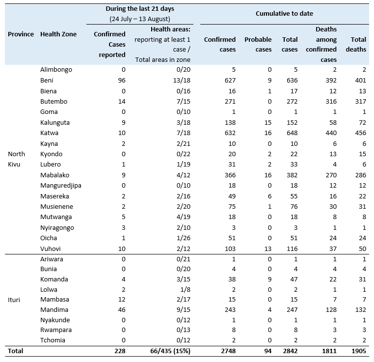 As of 13 August, a total of 2842 EVD cases were reported, including 2748 confirmed and 94 probable cases, of which 1905 cases died (overall case fatality ratio 67%). Of the total confirmed and probable cases, 57% (1608) were female, and 29% (815) were children aged less than 18 years.