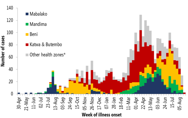 *Data in recent weeks are subject to delays in case confirmation and reporting, as well as ongoing data cleaning. Other health zones include: Alimbongo, Ariwara, Biena, Bunia, Goma, Kalunguta, Kayna, Komanda, Kyondo, Lolwa, Lubero, Mambasa, Manguredjipa, Masereka, Musienene, Mutwanga, Mwenga, Nyankunde, Nyiragongo, Oicha, Pinga, Rwampara, Tchomia, and Vuhovi.