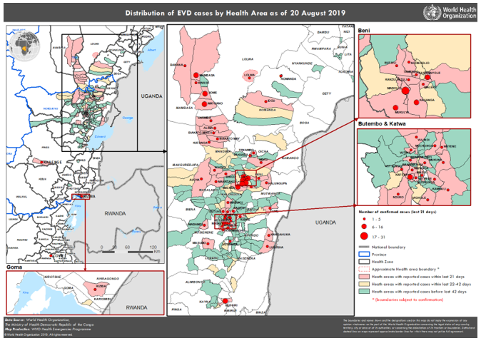 On 19 August 2019, a “ville morte” protest took place in Beni, Butembo, and Oicha in response to recent attacks by armed groups on civilians. This resulted in a temporary suspension of Ebola response activities. Operations resumed on 20 August 2019 with increased caution, and further demonstrations are anticipated. The suspension of Ebola response activities often results in an increase of case numbers and spread of cases to new areas in the subsequent weeks.
