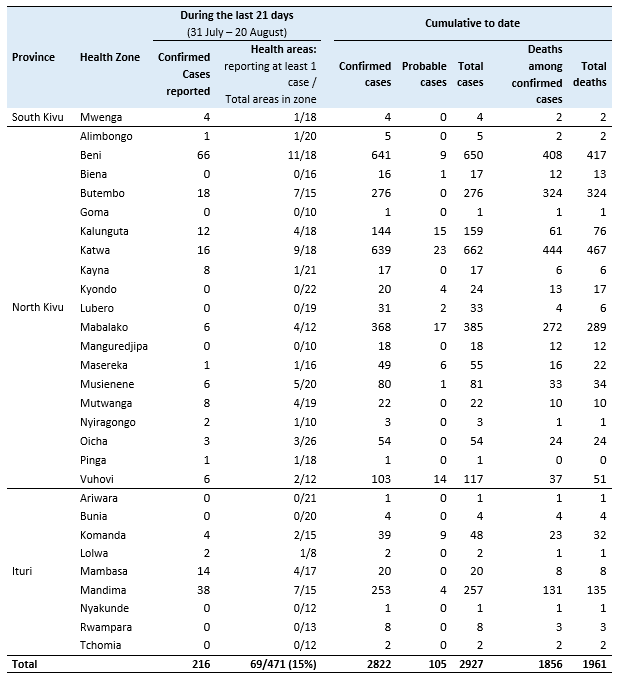 As of 20 August, a total of 2927 EVD cases were reported, including 2822 confirmed and 105 probable cases, of which 1961 cases died (overall case fatality ratio 67%). Of the total confirmed and probable cases, 58% (1697) were female, and 28% (830) were children aged less than 18 years. To date, 154 health workers have been infected.