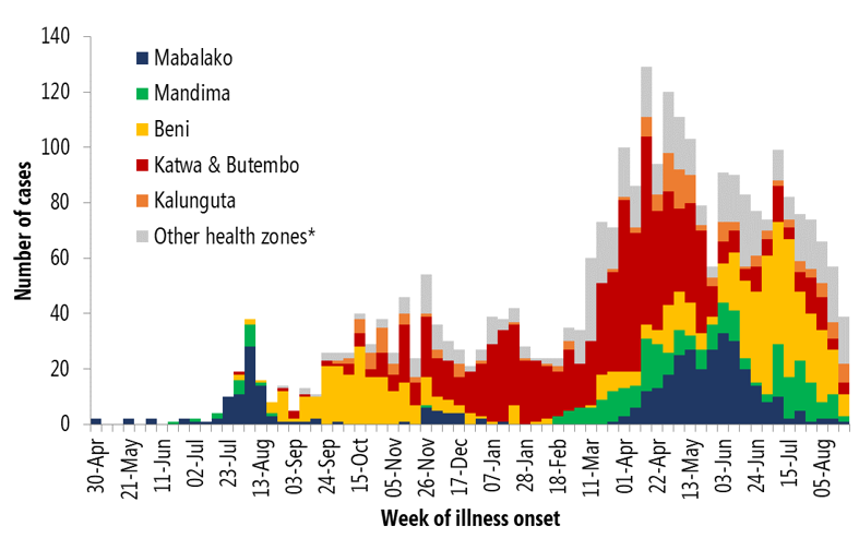 *Data in recent weeks are subject to delays in case confirmation and reporting, as well as ongoing data cleaning. Other health zones include: Alimbongo, Ariwara, Biena, Bunia, Goma, Kalunguta, Kayna, Komanda, Kyondo, Lolwa, Lubero, Mambasa, Manguredjipa, Masereka, Musienene, Mutwanga, Mwenga, Nyankunde, Nyiragongo, Oicha, Pinga, Rwampara, Tchomia, and Vuhovi.