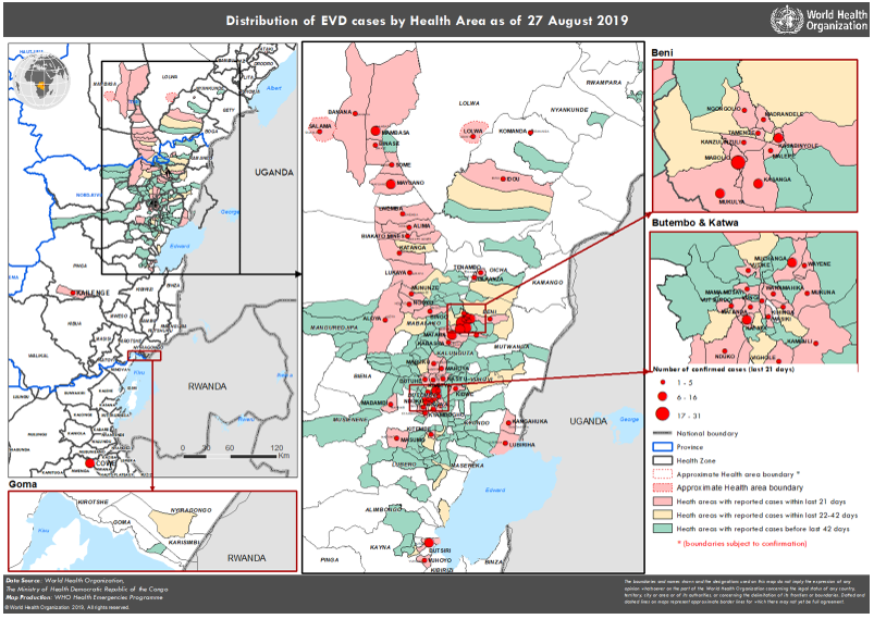 On 22 August, Nyiragongo Health Zone (which includes suburbs of Goma city) passed 21 days without additional confirmed cases detected, and all contacts completed the 21-day follow-up period. Surveillance and response activities within Goma city and surrounding areas will continue, as risks of further introduction of EVD from active areas remain high.