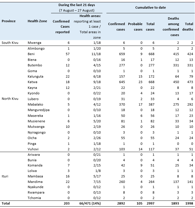 As of 27 August, a total of 2997 EVD cases were reported, including 2892 confirmed and 105 probable cases, of which 1998 cases died (overall case fatality ratio 67%). Of the total confirmed and probable cases, 58% (1740) were female, and 28% (842) were children aged less than 18 years. To date, 156 health workers have been infected.