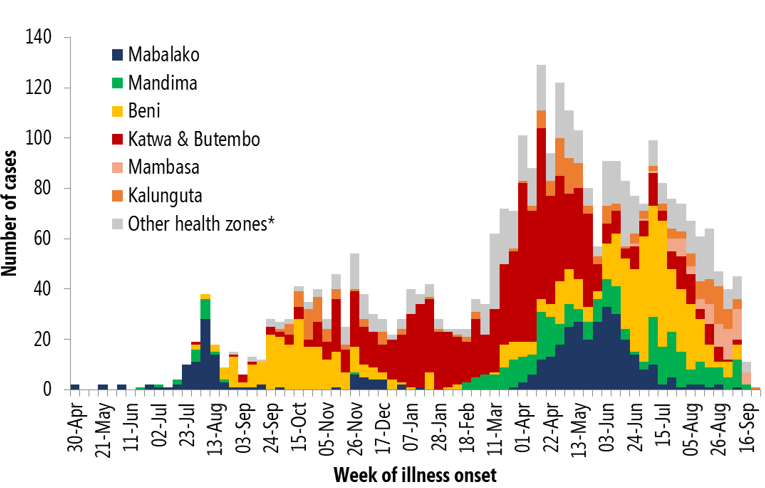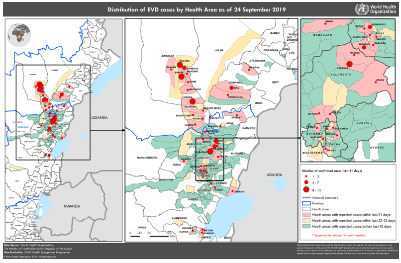 The Ebola virus disease (EVD) outbreak in the Democratic Republic of the Congo continues this week with 29 new confirmed cases reported in North Kivu and Ituri provinces from 18-24 September 2019, versus 57 in the previous week. This decrease in the number of cases should be interpreted with caution, as operational and security challenges in certain health zones make it difficult to undertake case detection and response functions.