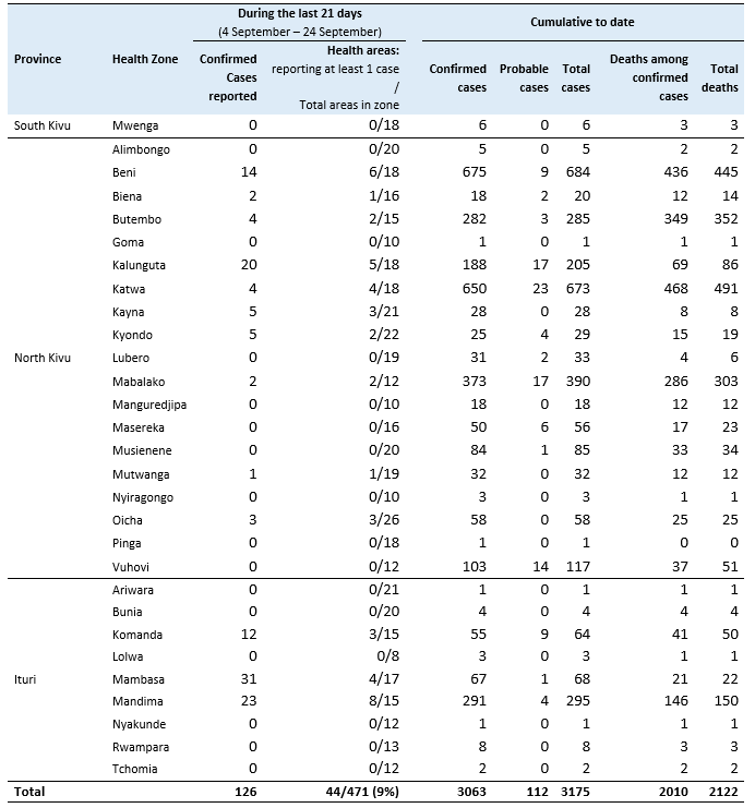 As of 24 September, a total of 3175 EVD cases were reported, including 3063 confirmed and 112 probable cases, of which 2122 cases died (overall case fatality ratio 67%). Of the total confirmed and probable cases, 56% (1778) were female, 28% (902) were children aged less than 18 years, and 5% (161) were health workers.
