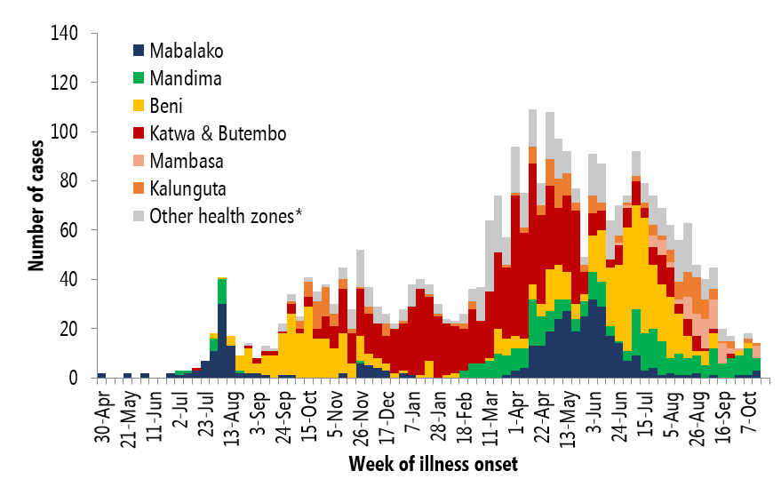 *Excludes n=184 cases for whom onset dates not reported. Data in recent weeks are subject to delays in case confirmation and reporting, as well as ongoing data cleaning. Other health zones include: Alimbongo, Ariwara, Biena, Bunia, Goma, Kalunguta, Kayna, Komanda, Kyondo, Lolwa, Lubero, Manguredjipa, Masereka, Musienene, Mutwanga, Mwenga, Nyankunde, Nyiragongo, Oicha, Pinga, Rwampara, Tchomia, and Vuhovi. .