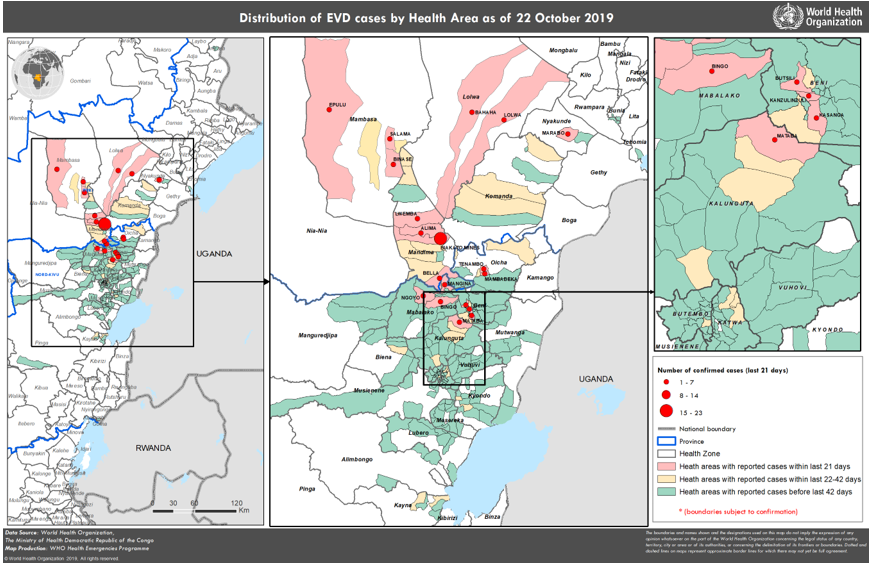The number of confirmed cases of Ebola virus disease (EVD) remains relatively low this week, with 21 new confirmed cases reported in North Kivu and Ituri provinces during the epidemiological week of 14 – 20 October. The observed fluctuation in case incidence (Figure 1) may be expected given the challenges faced by response teams in the prior weeks.