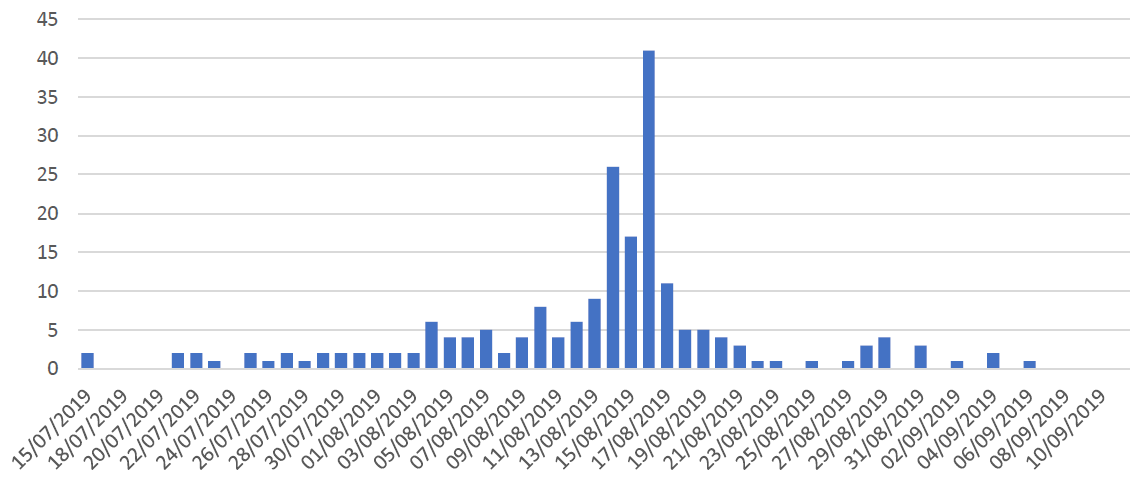 From 7 July through 13 September , a total of 222 confirmed cases linked to this outbreak have been reported in five regions of Spain: Andalusia (214), Aragon (4), Extremadura (2), Castilla y Leon (1), and Madrid (1). Fifty-seven per cent of cases are women including 38 pregnant women and 24% of cases are 65 years old or above (24 men and 25 women). Three deaths have been reported among elderly persons who were ill with listeriosis at the time of death. Reportedly, six women had miscarriages linked to this outbreak. On 23 August 2019, France, through the European Commission Early Warning and Response System (EWRS), notified a travel related case in a foreign citizen with travel history to Andalusia who had consumed the implicated product. Only three cases of listeriosis have been recorded with a date of consumption after 17 August, but all the three bought the product before the food alert was launched.