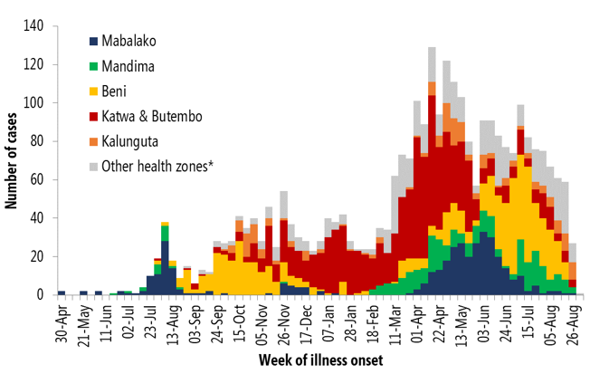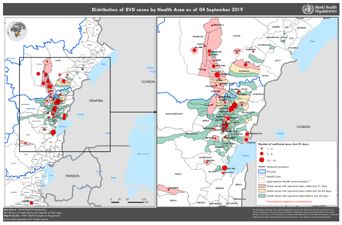 The intensity of Ebola virus disease (EVD) transmission in the North Kivu, South Kivu, and Ituri provinces remains substantial, with 57 new cases reported since the last EVD in the Democratic Republic of the Congo Disease Outbreak News Update on 29 August. While hotspots such as Beni Health Zone show signs of easing, new hotspots are emerging elsewhere. During the past 21 days, from 14 August through 4 September 2019, a total of 186 confirmed cases were reported, with the majority coming from the health zones of Beni (17%, n=31), Kalunguta (15%, n=28), Mandima (13%, n=24), and Mambasa (12%, n=22). Given the limited access and insecurity in the emerging clusters within Kalunguta, Mandima, and Mambasa health zones, the response activities have been somewhat hindered.