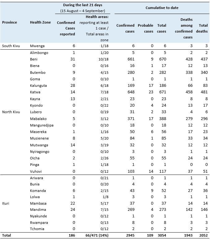 As of 4 September, a total of 3054 EVD cases were reported, including 2945 confirmed and 109 probable cases, of which 2052 cases died (overall case fatality ratio 67%). Cases have been reported from 29 health zones since the beginning of this outbreak, of which 17 health zones reported new cases in the last 21 days (Table 1, Figure 2). Of the total confirmed and probable cases, 58% (1772) were female, 28% (865) were children aged less than 18 years, and 5% (156) were health workers.