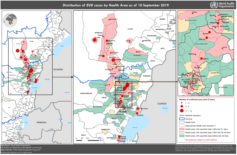 During the past 21 days (from 21 August through 10 September 2019), a total of 157 confirmed cases were reported form 15 health zones (Table 1, Figure 2), with the majority coming from the health zones of Kalunguta (19%, n=30), Beni (18%, n=28), Mambasa (16%, n=25), and Mandima (13%, n=20). Alimbongo, Oicha, and Pinga health zones recently passed 21 days without a new confirmed case of EVD.