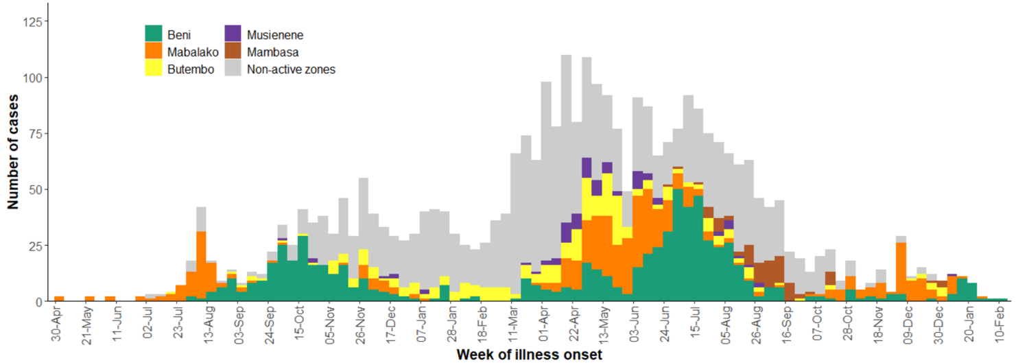 Figure 1: Confirmed and probable Ebola virus disease cases by week of illness onset by health zone. Data as of 11 February 2020*