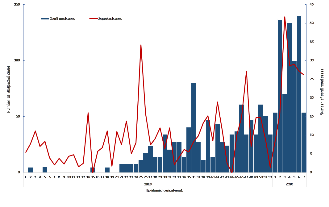 Figure 1. Distribution of suspected dengue cases by epidemiological week, French Guiana, January 2019 to 15 February 2020.