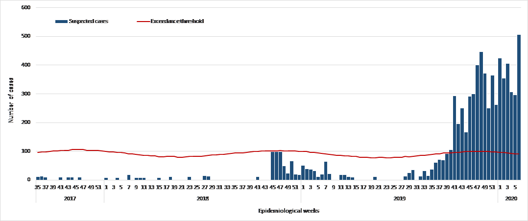 Figure 2. Distribution of suspected dengue cases by epidemiological week, Guadeloupe, August 2017 to 8 February 2020.