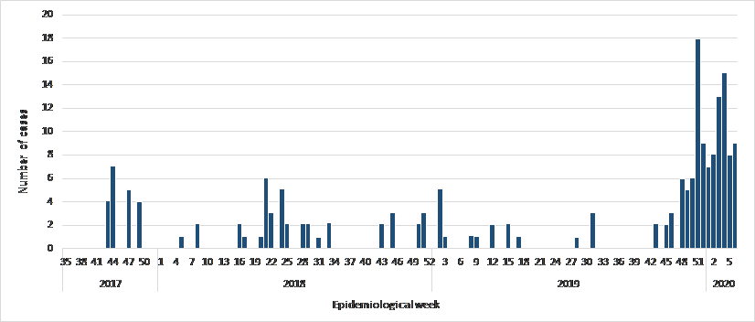 Figure 4. Distribution of suspected dengue cases by epidemiological week, Saint-Barthélemy, August 2017 to 8 February 2020.