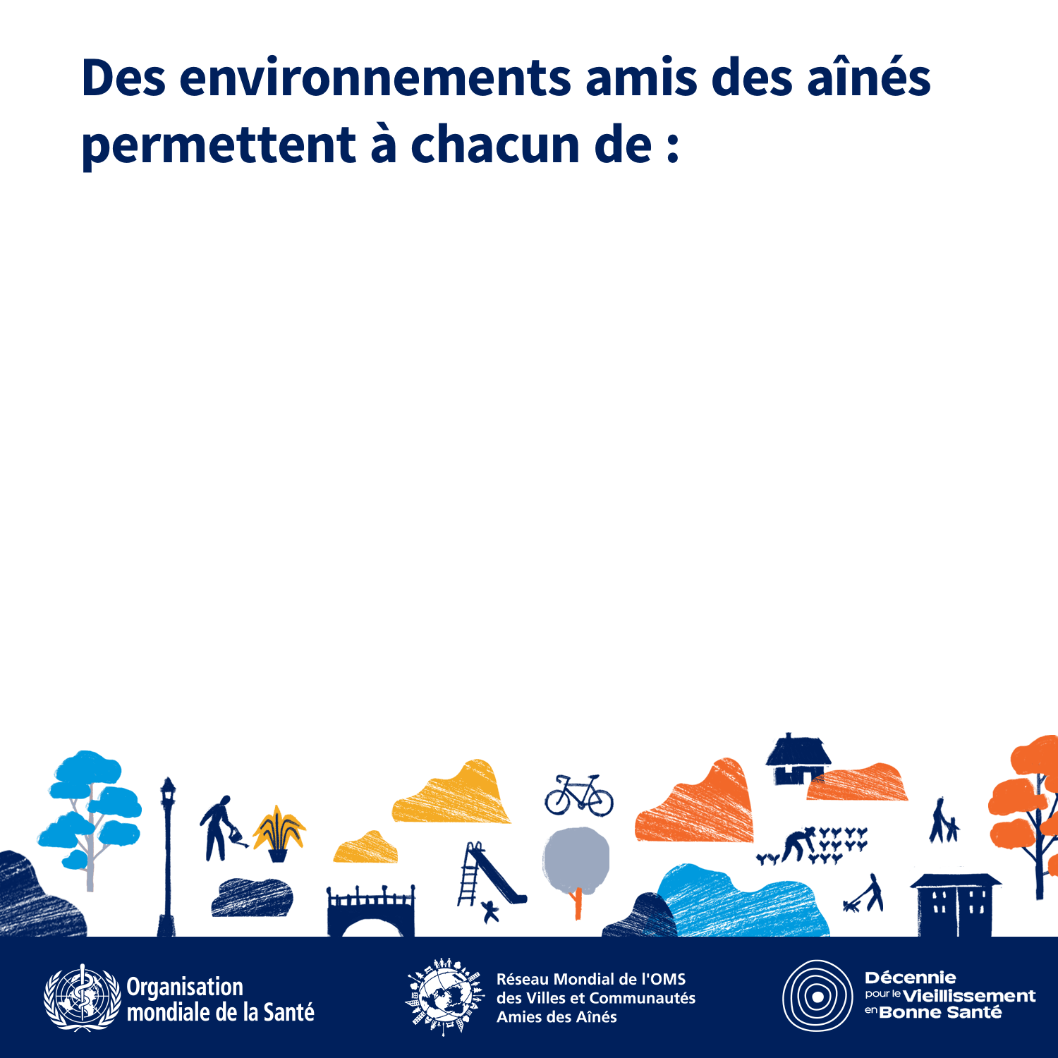 Nos environnements physiques et sociaux ont une influence majeure sur la façon dont nous vivons le vieillissement et sur les opportunités qu'il offre. La création d'environnements amis des aînés permet à chacun de bien vieillir dans un lieu qui lui convient, de continuer à s'épanouir personnellement, d'être intégré et de contribuer à la vie de sa communauté tout en préservant son indépendance et sa santé.
