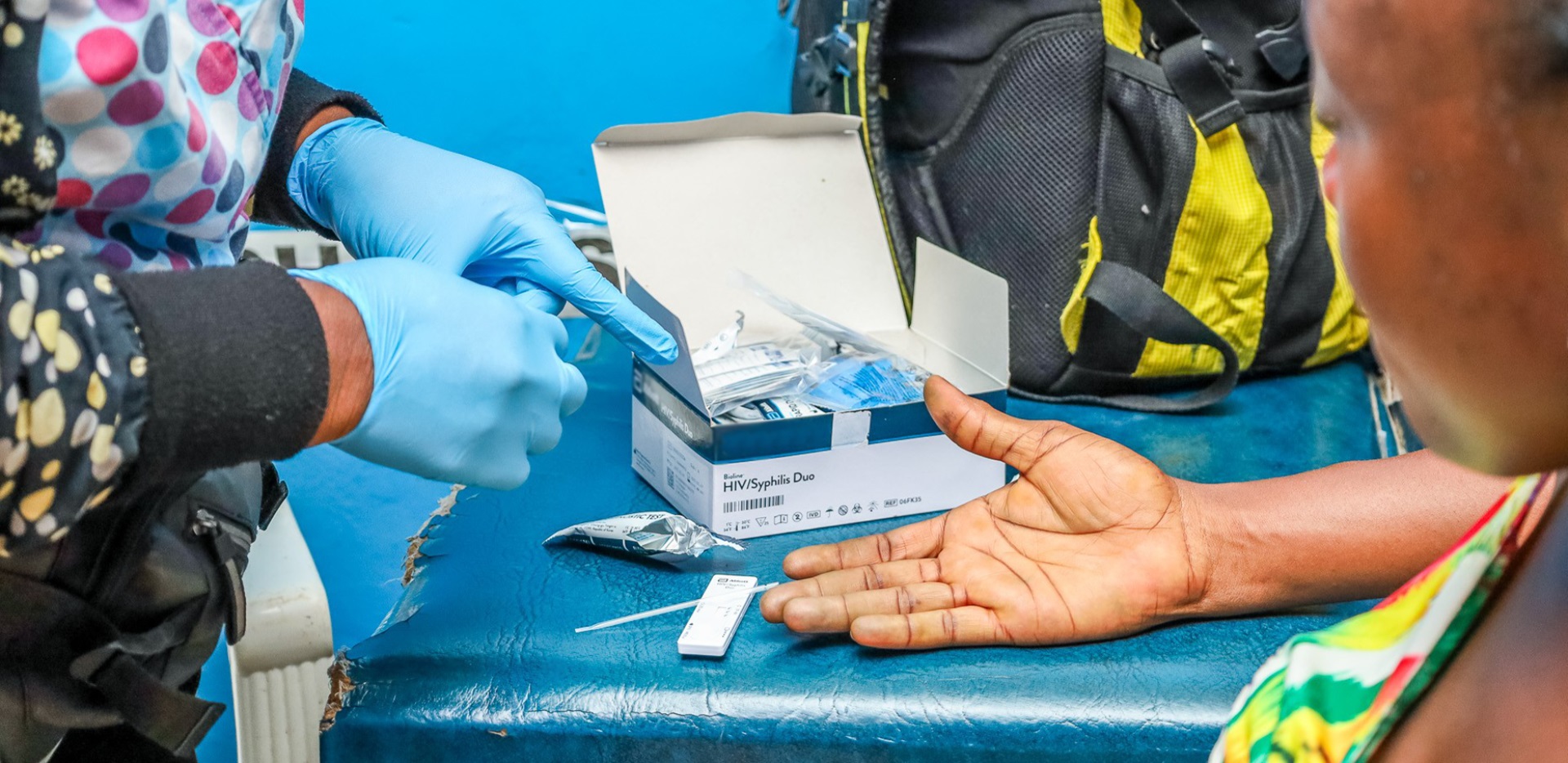 A nurse conducts a dual HIV/syphilis test on an expectant mother at Duport Road Health Center in Monrovia, Liberia