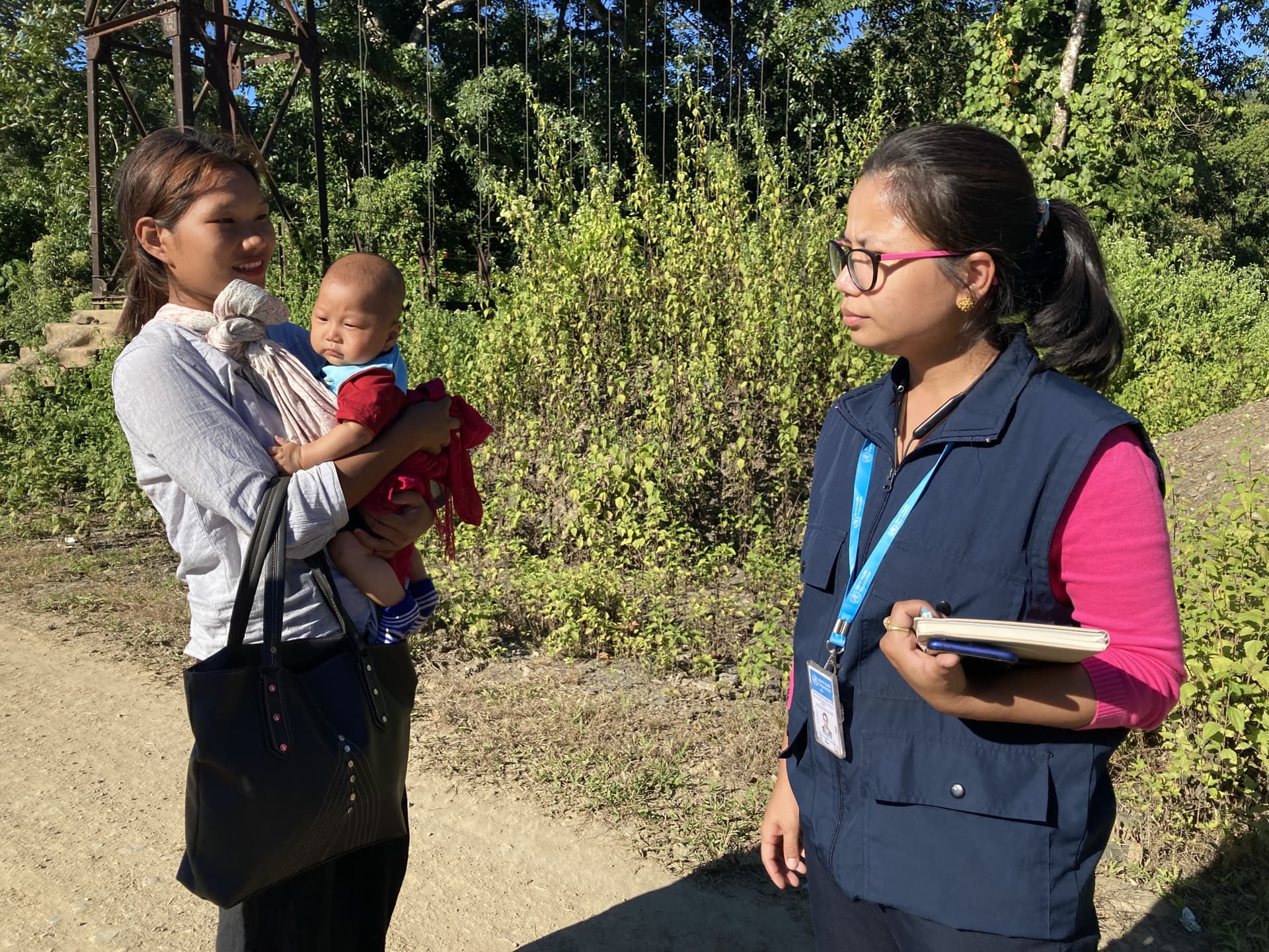 A young mother on her way back from a health centre shares her experience with WHO surveillance medical officer in Lungpang-II village in Changlang district, Arunachal Pradesh. (Photo: Sanchita Sharma / © WHO India)