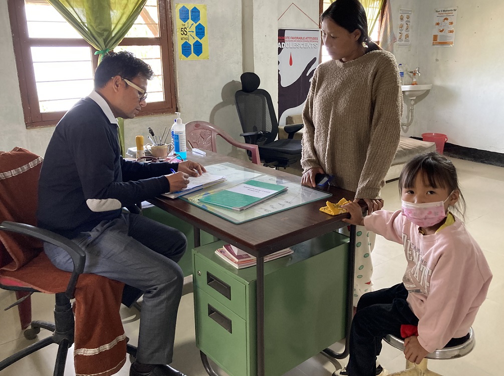 Dr Prakash Bharadwaj, medical officer and district immunization officer, Kamjong district, writing a cough prescription for Ms Iwgyn’s (short for ‘I will glorify your name’) daughter at PHC Pungyar (Photo: Sanchita Sharma / © WHO India)