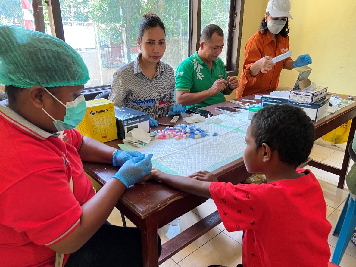 A courageous six-year-old boy residing in Sorong City underwent blood examination with a rapid diagnostic test during the pre-TAS. Photo Credit: WHO/Agrin Zauyani Putri