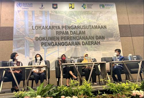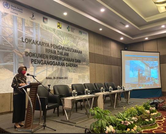 Through WHO support, Bappenas in collaboration with the Indonesia Association of Drinking Water Providers (Persatuan Perusahaan Air Minum Seluruh Indonesia-Perpamsi) conducted a workshop on mainstreaming WSPs in the regional planning and budgeting document. This activity aimed to advocate for the local government at provincial, district and municipality levels to link actions related to water safety and drinking water quality surveillance to the planning and budgeting process. The two-day workshop was conducted on 28-29 March 2022, with over 100 participants representing 18 provinces from three Provincial Development Planning Agencies (Bappeda), 30 district/municipalities’ Bappeda, representatives from 41 local drinking water providers (Perumdam), and implementing partners like Australia’s Department of Foreign Affairs and Trade (DFAT), Indonesia Australia Partnership for Infrastructure (KIAT), USAID, and the World Bank.