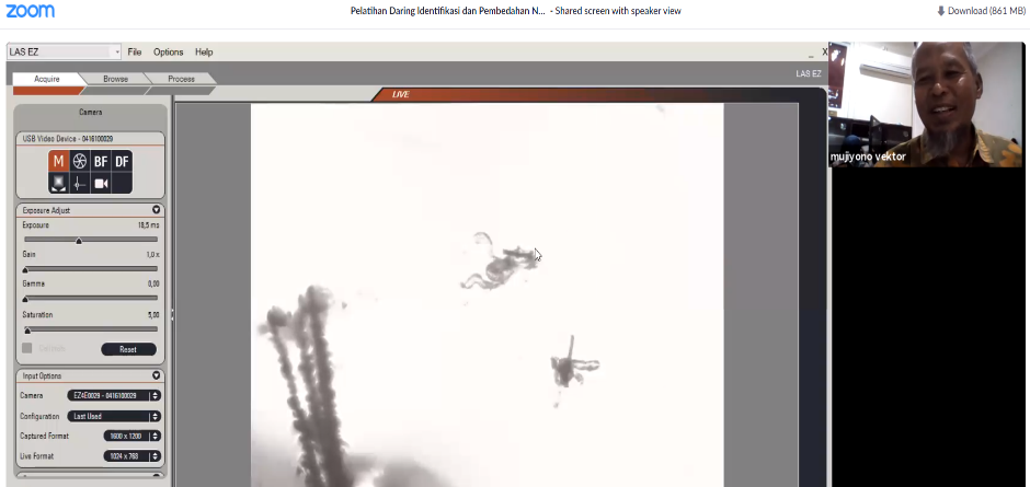 Caption: Trainer from BBPPVRP Salatiga demonstrated the method of mosquito species identification using trinocular stereo microscope with camera.