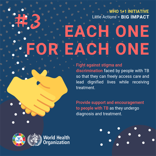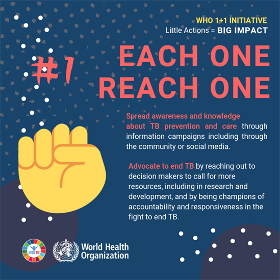 In 2019, WHO launched a new initiative called 1+1 on the occasion of World Tuberculosis Day. The initiative aims at advancing engagement with young people, and amplifying their voices to end TB. Youth can have a multiplier effect in the fight to end TB, to accelerate progress towards reaching the ambitious 2022 targets of the UN high-level meeting on ending TB, as well as the larger goal of ending TB by 2030.