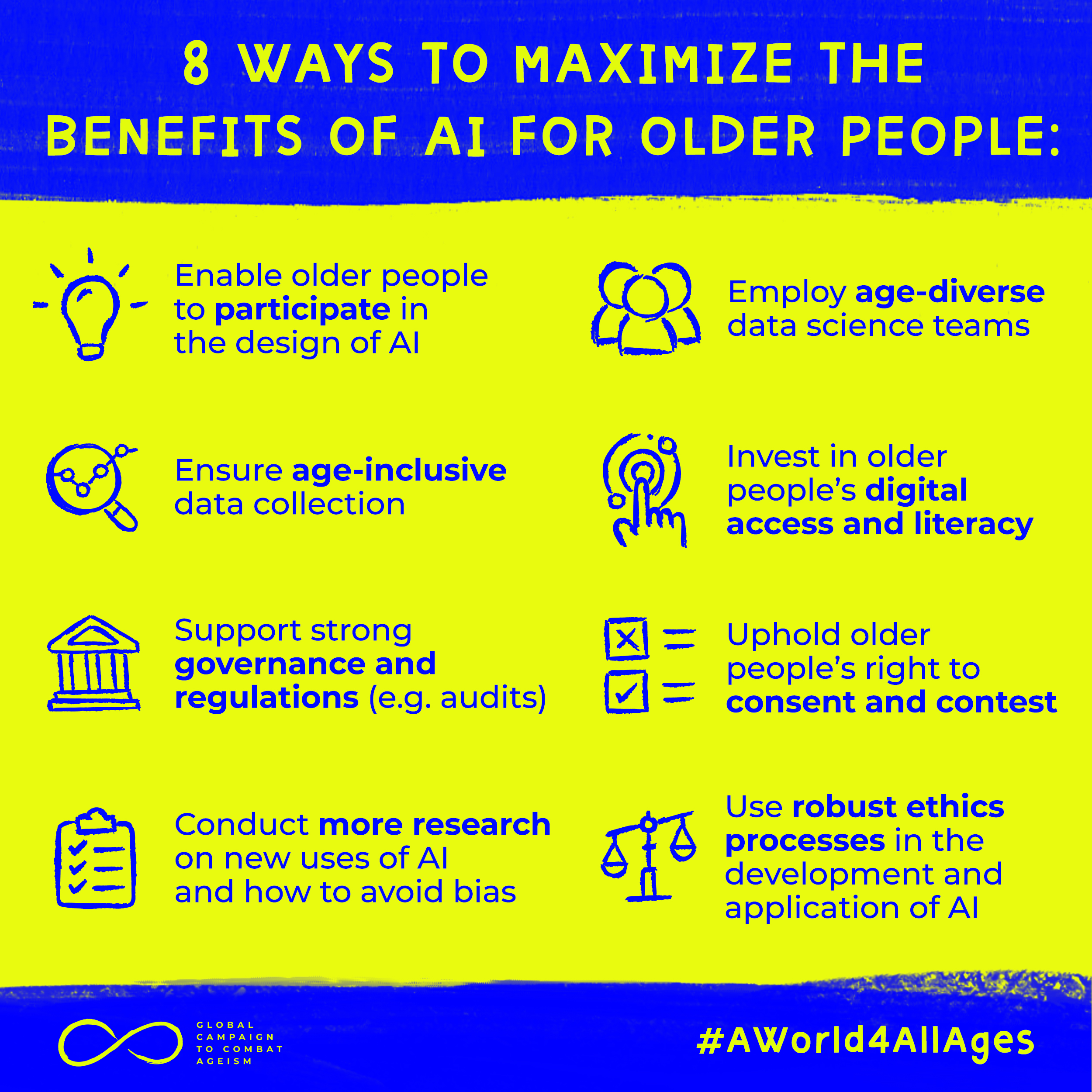 8 Ways to Maximize the Benefits of AI for Older People 9 February 2022 | graphics (social media tile) WHO Team Demographic Change and Healthy Ageing (DHA), Health Ethics & Governance (HEG)