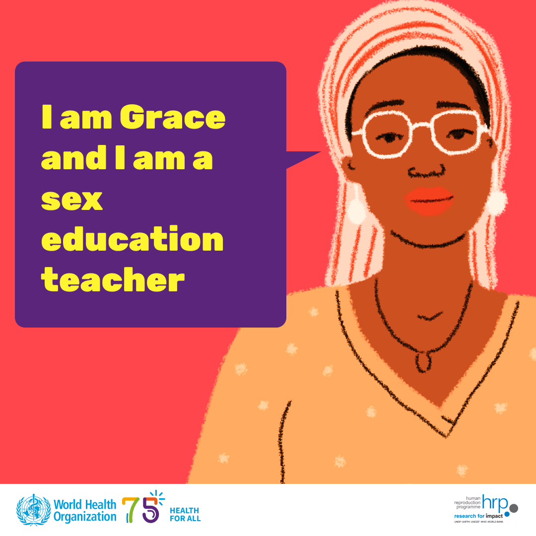 I am Grace and I am a sex education teacher 26 March 2024 | graphics (animated image) WHO Team Sexual and Reproductive Health and Research (SRH)
