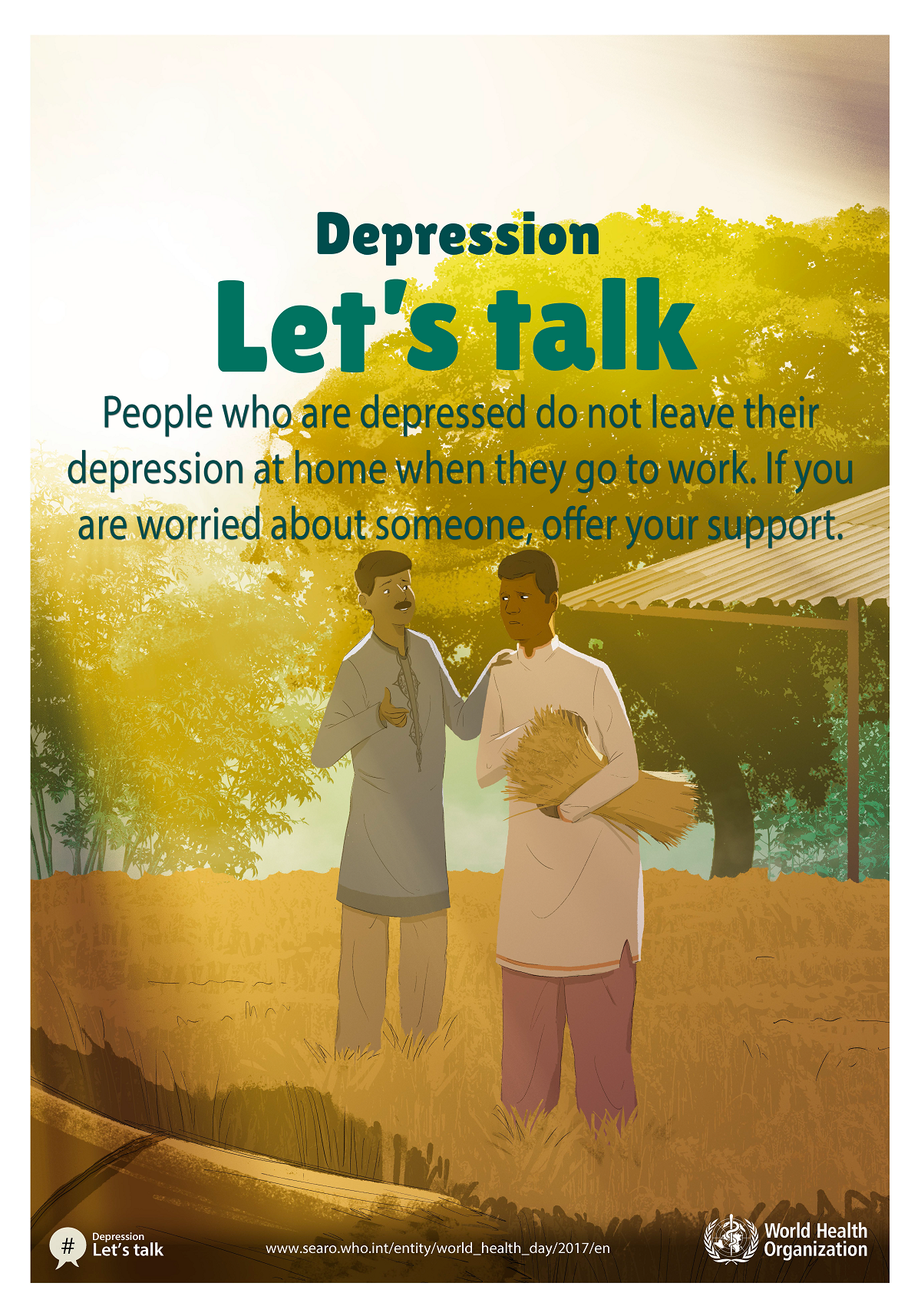 Depression can affect anyone. So this campaign is for everyone, whatever your age, sex, or social status. At the World Health Organization, we have chosen to pay particular attention to three groups that are disproportionally affected: adolescents and young adults, women of childbearing age (particularly following childbirth), and older adults (over 60s). Materials targeting these audiences are available in the campaign materials.