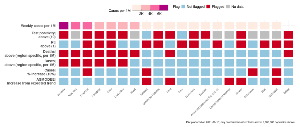 In the Flags sub-tab, you can visualize how a country, area or territory is doing on these metrics with coloured flags: a blue flag means that the numbers are pointing in the right direction, while a red flag means the opposite.Using machine learning to detect departure from trends