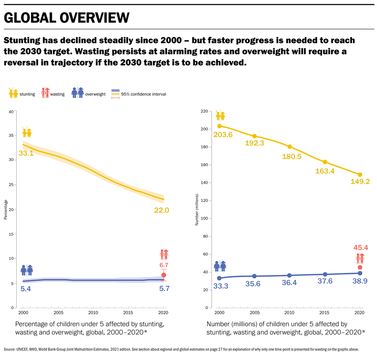 Child malnutrition estimates for the indicators stunting, wasting, overweight and underweight describe the magnitude and patterns of under- and overnutrition. UNICEF-WHO-WB Joint Child Malnutrition Estimates inter-agency group updates regularly the global and regional estimates in prevalence and numbers for each indicator. The key findings 2021 Edition includes global and regional trends and, for the first time, country-level estimates are also presented, with a summary of the enhanced methodology for deriving country-level model-based estimates for stunting and overweight. Country progress assessment towards the 2030 targets are provided with summaries by region.