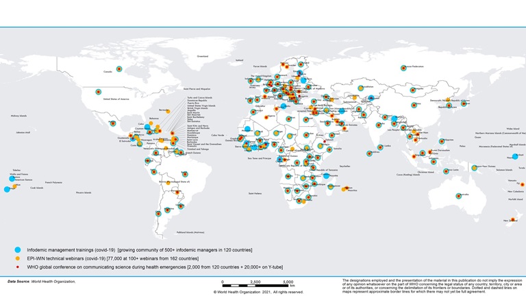 The World Health Organization (WHO) has expanded the global community of practice of infodemic managers to more than 500 trainees from 120 countries following the completion of the 2nd WHO Global Infodemic Management training. The map shows the geographical range of infodemic managers, located across all of the 6 WHO regions.