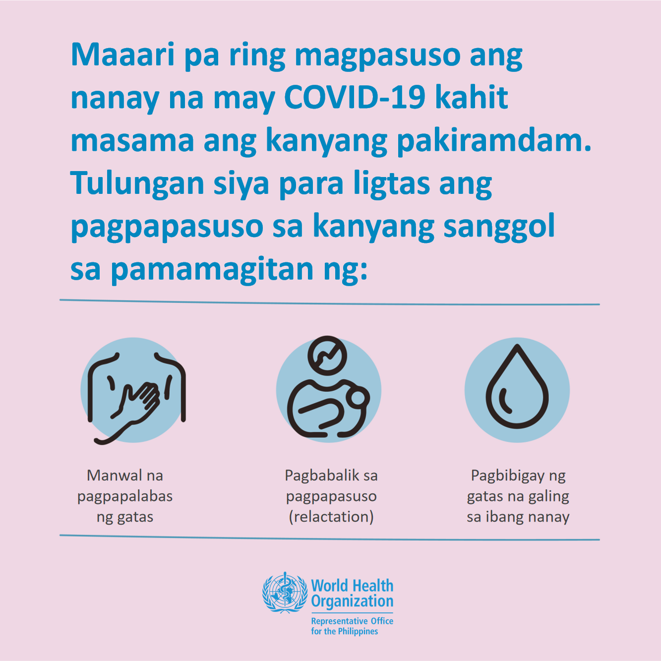 Ang isang babaeng hinihinala o kumpirmadong COVID-19 ay dapat hikayatin na simulan o magpatuloy na magpasuso.