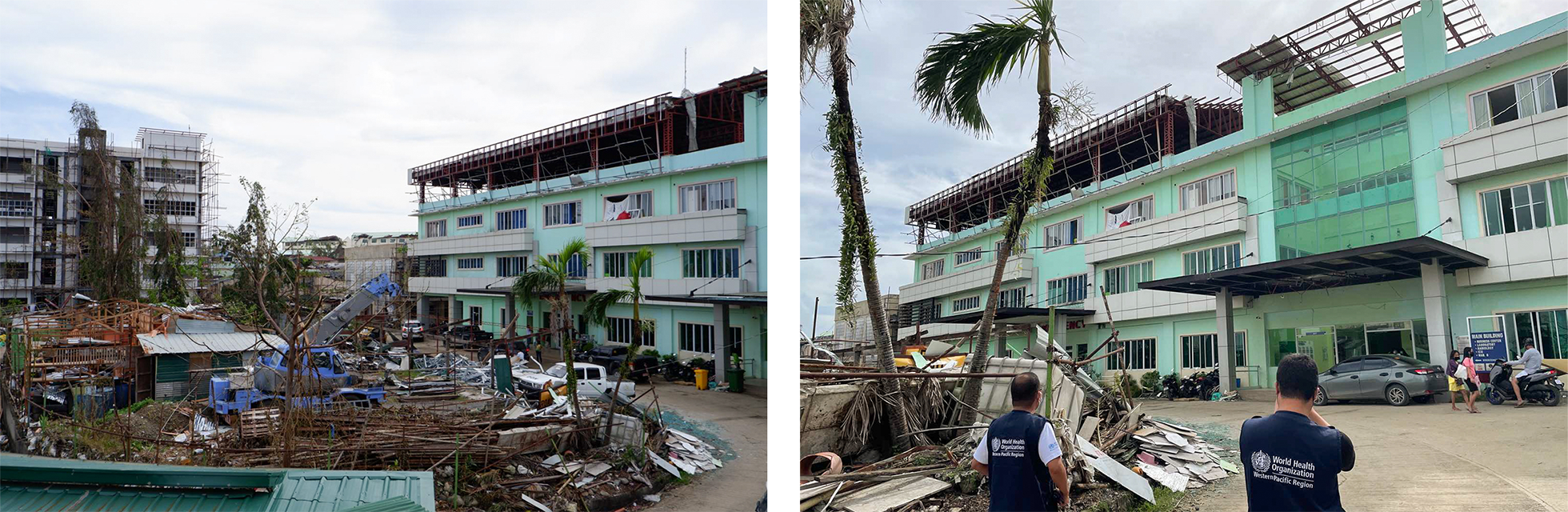 The CARAGA Regional Hospital in Surigao City sustained damages in its upper floors but remains operational, with over 200 admitted patients, including suspected and confirmed COVID-19 cases. © WHO Philippines