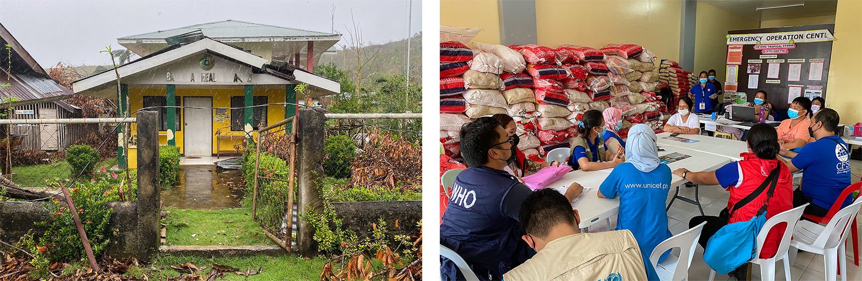 (Left) A barangay health station (BHS) in Brgy Panamaon sustained partial damages. This BHS is in Loreto town at the northern tip of Dinagat Island. (Right) Staff from the Department of Social Welfare and Development (DSWD) and the UN HCT met with Mayor Simplicia Pedrablanca of Tubajon town in Dinagat Island for the assessment of the humanitarian needs of over 8,000 families affected by Typhoon Odette. © WHO Philippines
