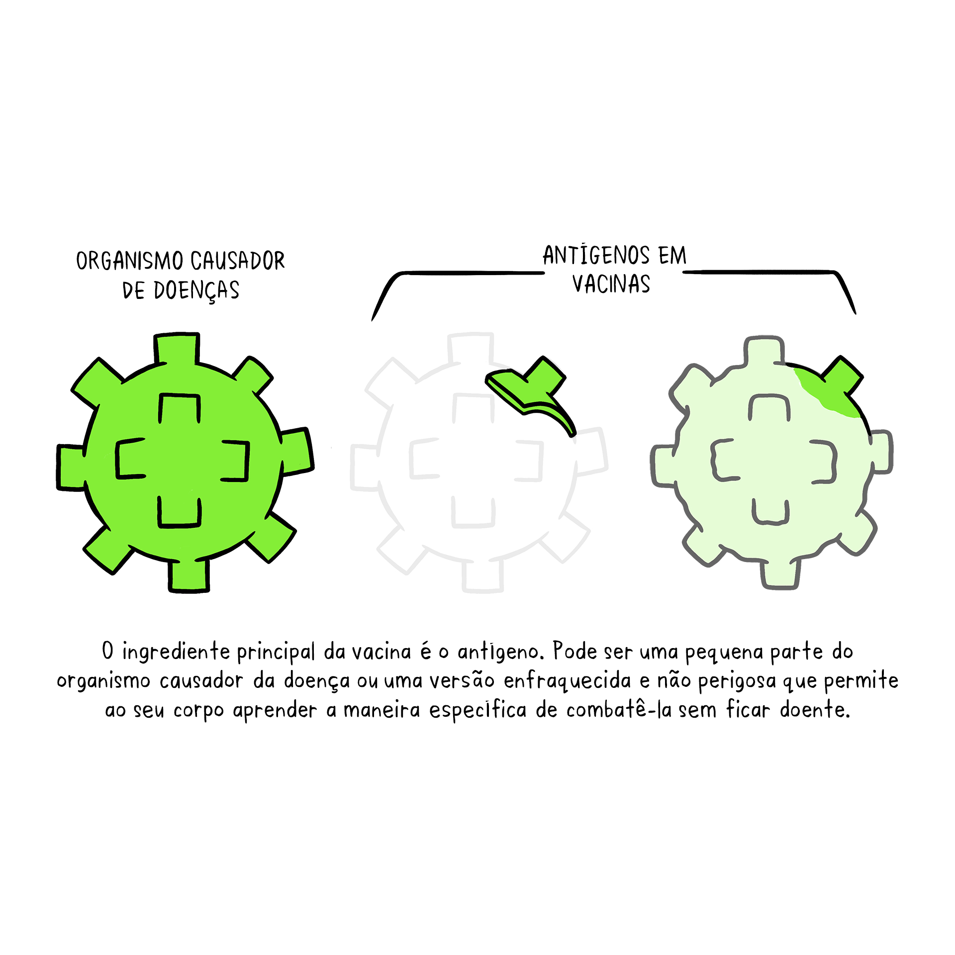 Todas as vacinas contêm um componente ativo (o antigénio) que gera uma resposta do sistema imunitário, ou a matriz para fazer o componente ativo. O antigénio pode ser uma pequena parte do organismo causador da doença, como uma proteína ou um açúcar, ou pode ser todo o organismo numa forma enfraquecida ou inativada.