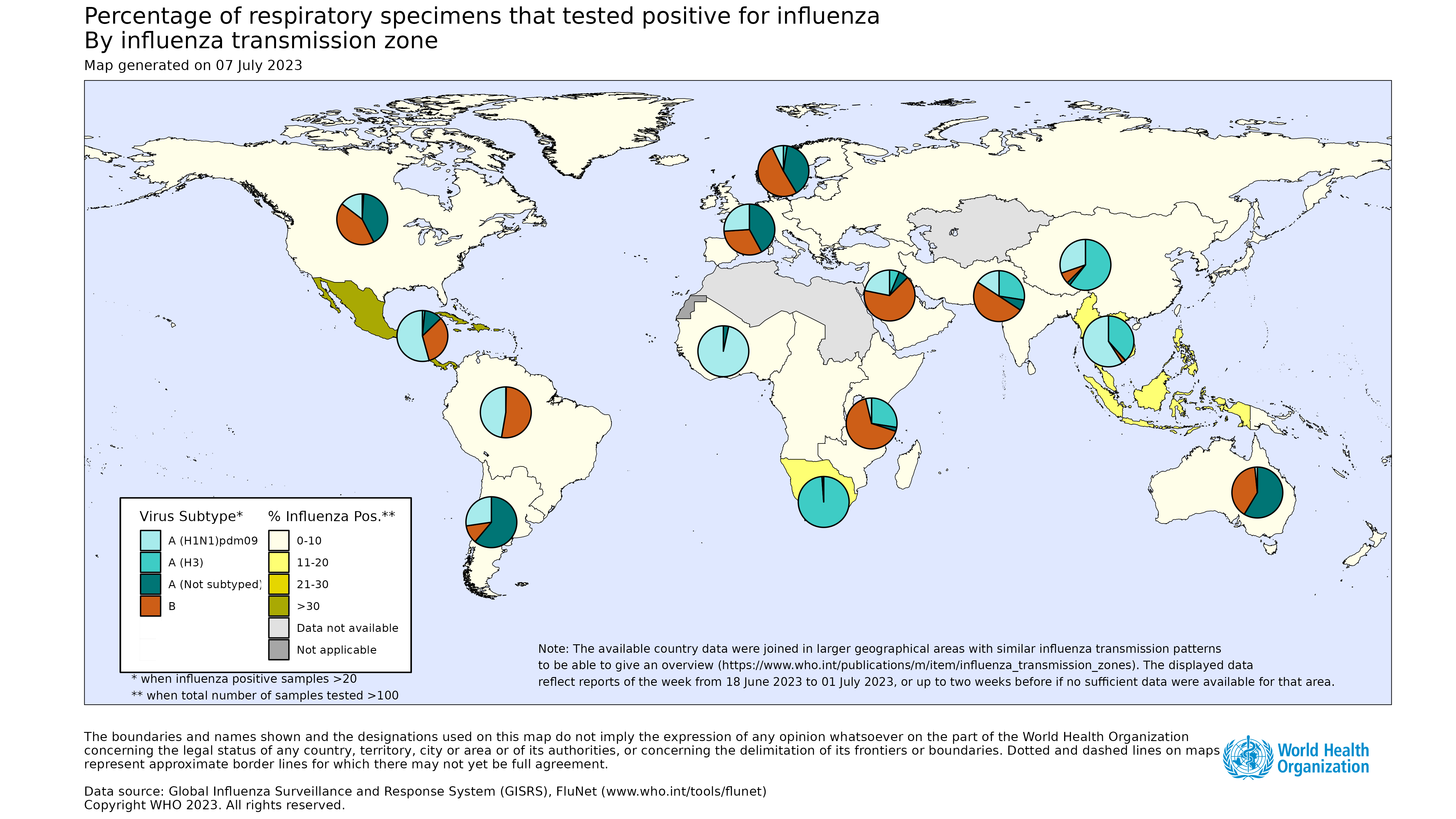 - National Influenza Centres (NICs) and other national influenza laboratories from 107 countries, areas or territories reported data to FluNet for the time period from 12 June 2023 to 25 June 2023 (data as of 07/07/2023 07:03:51 AM UTC). The WHO GISRS laboratories tested more than 265 159 specimens during that time period. 6147 were positive for influenza viruses, of which 4142 (67.4%) were typed as influenza A and 2005 (32.6%) as influenza B. Of the sub-typed influenza A viruses, 1768 (74.3%) were influenza A(H1N1)pdm09 and 611 (25.7%) were influenza A(H3N2). Of the type B viruses for which lineage was determined, all (458) belonged to the B/Victoria lineage.