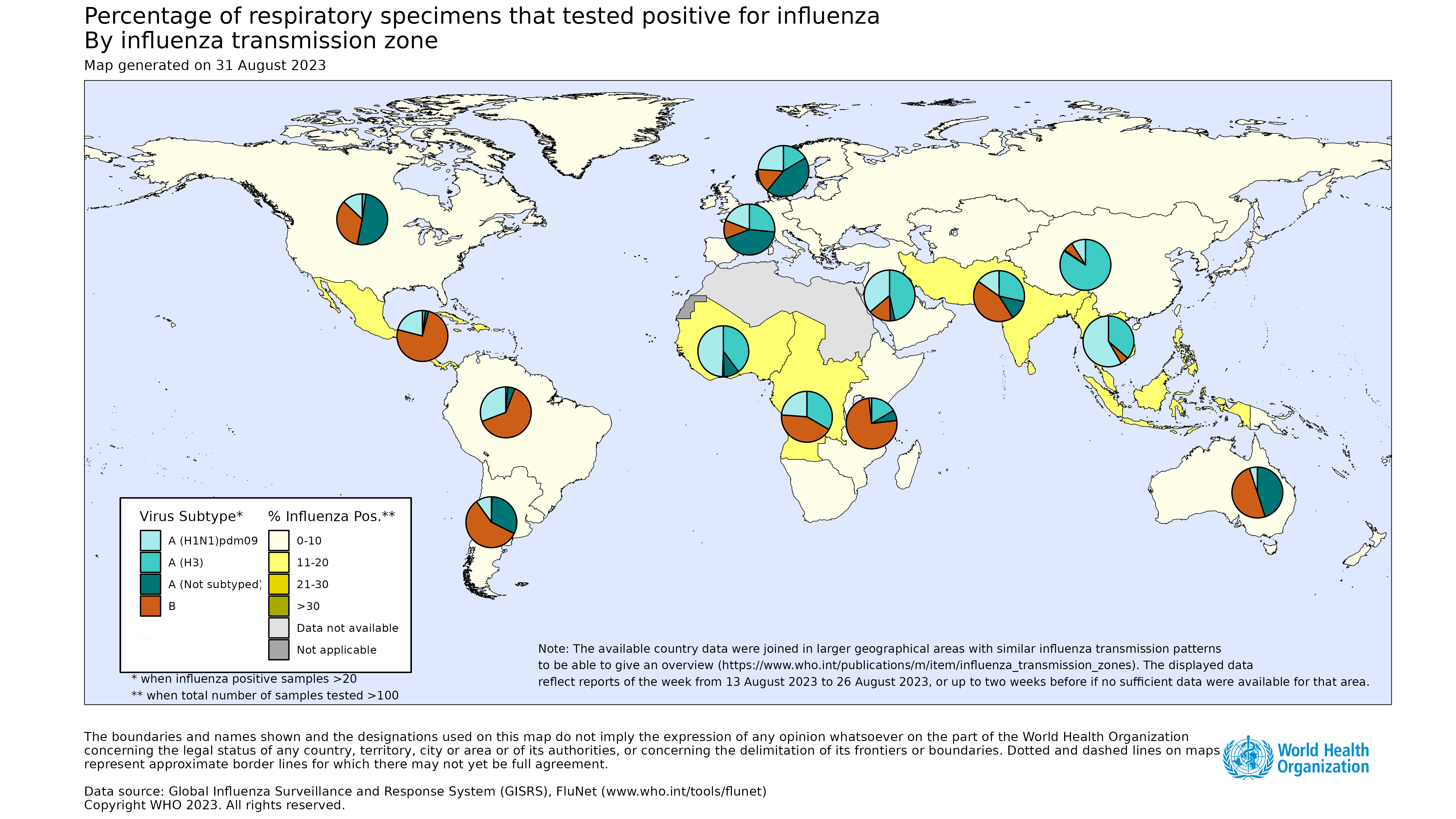 - National Influenza Centres (NICs) and other national influenza laboratories from 108 countries, areas or territories reported data to FluNet for the time period from 7 August 2023 to 20 August 2023 (data as of 31/08/2023 04:10:26 PM UTC). The WHO GISRS laboratories tested more than 230 916 specimens during that time period. 5040 were positive for influenza viruses, of which 3558 (70.6%) were typed as influenza A and 1482 (29.4%) as influenza B. Of the sub-typed influenza A viruses, 991 (38.0%) were influenza A(H1N1)pdm09 and 1617 (62.0%) were influenza A(H3N2). Of the type B viruses for which lineage was determined, all (560) belonged to the B/Victoria lineage.
