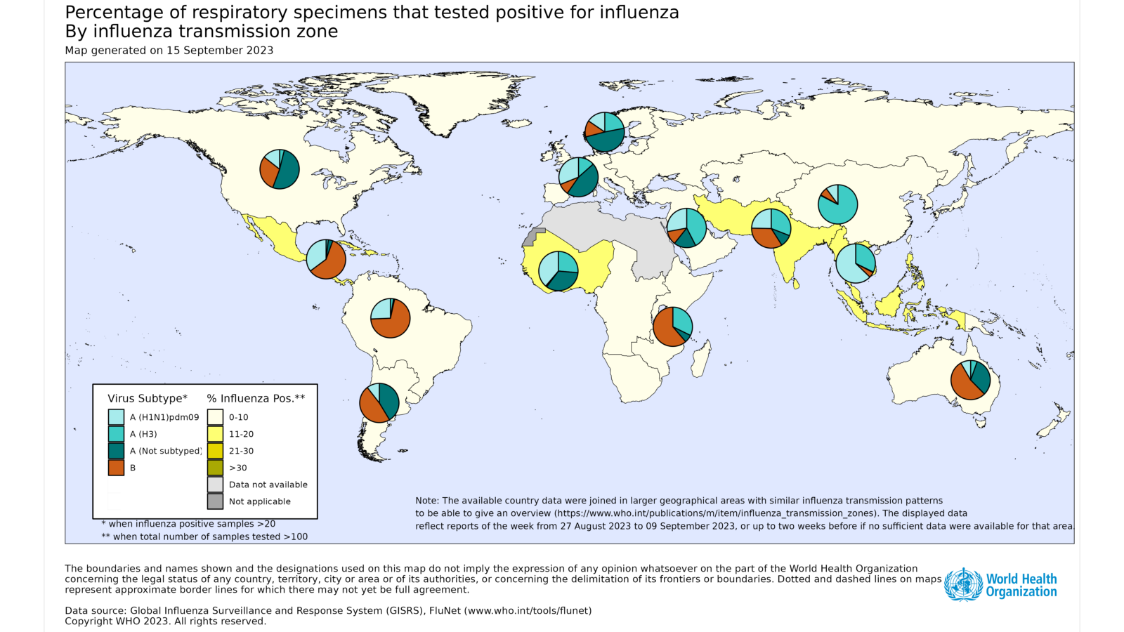 - National Influenza Centres (NICs) and other national influenza laboratories from 111 countries, areas or territories reported data to FluNet for the time period from 21 August 2023 to 03 September 2023* (data as of 15/09/2023 07:21:52 AM UTC). The WHO GISRS laboratories tested more than 252 496 specimens during that time period. 5934 were positive for influenza viruses, of which 4591 (77.37%) were typed as influenza A and 1343 (22.63%) as influenza B. Of the sub-typed influenza A viruses, 1231 (34.91%) were influenza A(H1N1)pdm09 and 2295 (65.09%) were influenza A(H3N2). Of the type B for which lineage was determined, all (467) belonged to the B/Victoria lineage.