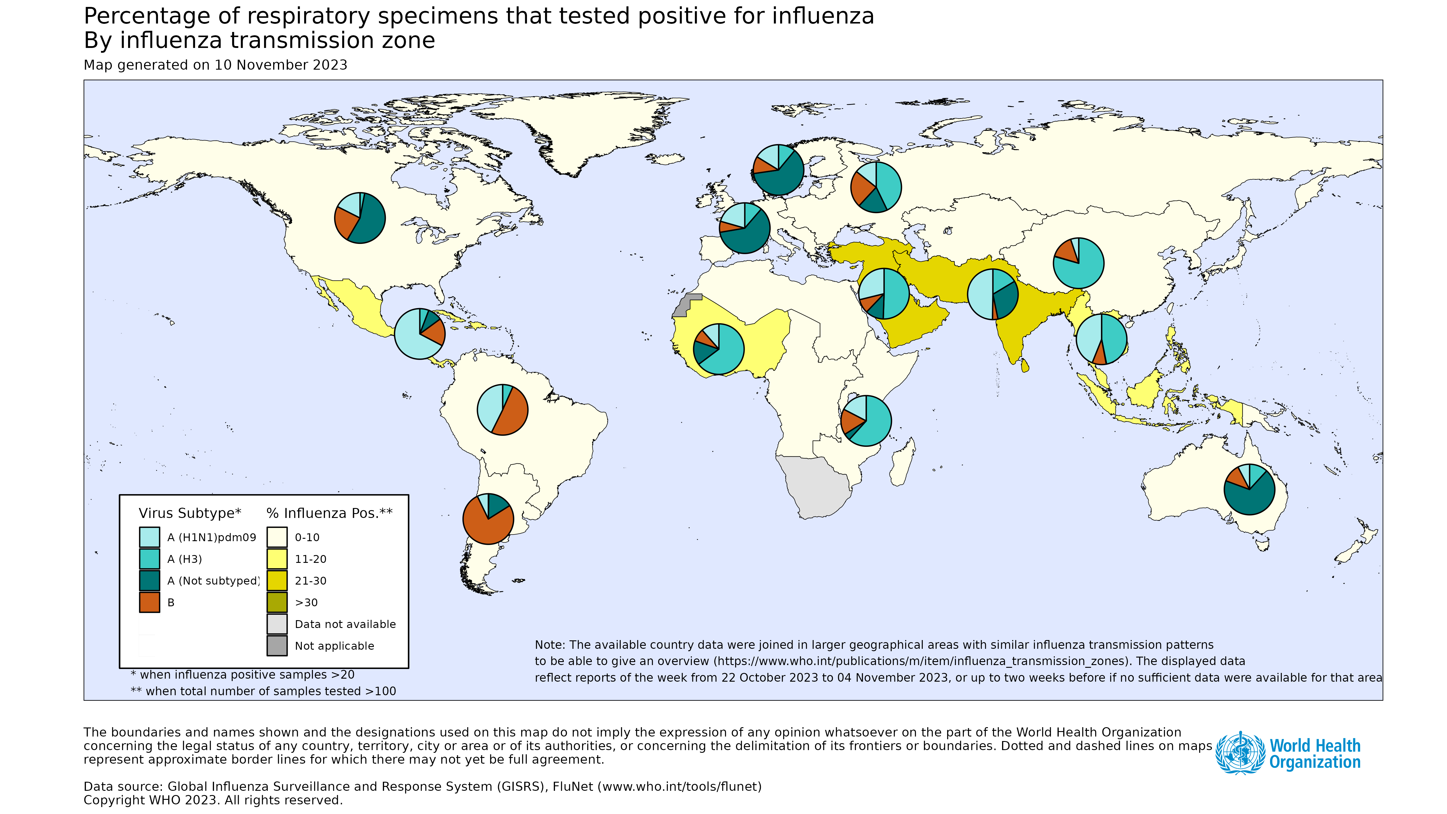 - National Influenza Centres (NICs) and other national influenza laboratories from 109 countries, areas or territories reported data to FluNet for the period from 16 October 2023 to 29 October 2023 (data as of 10/11/2023 06:08:00 AM UTC). The WHO GISRS laboratories tested more than 262 187 specimens during that period. 14 448 were positive for influenza viruses, of which 12 366 (86.0%) were typed as influenza A and 2082 (14.4%) as influenza B. Of the sub-typed influenza A viruses, 3251 (32.6%) were influenza A(H1N1)pdm09 and 6720 (67.4%) were influenza A(H3N2). Of the type B viruses for which lineage was determined, all (1295) belonged to the B/Victoria lineage.