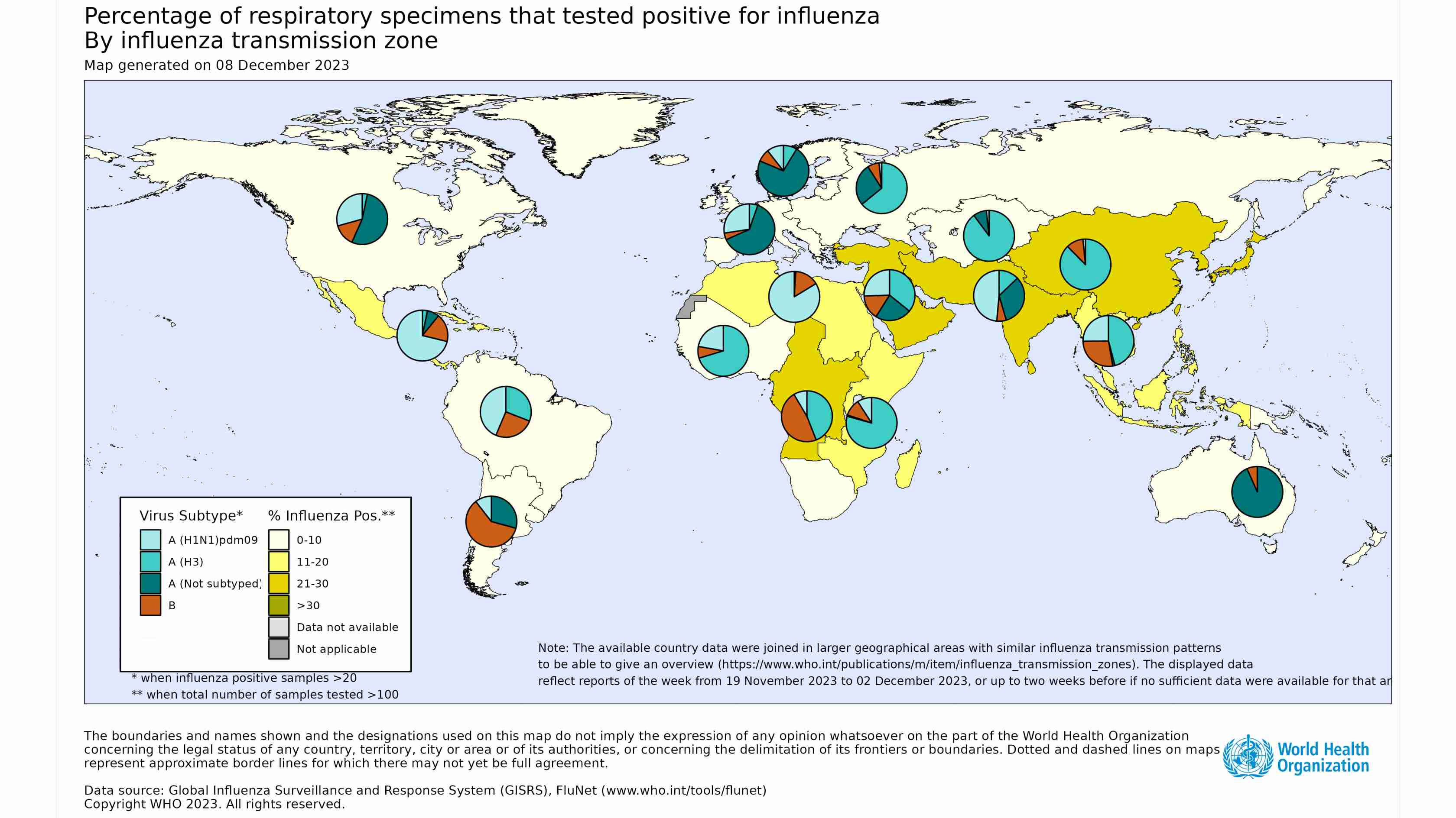 - National Influenza Centres (NICs) and other national influenza laboratories from 122 countries, areas or territories reported data to FluNet for the period from 13 November 2023 to 26 November 2023 (data as of 08/12/2023 06:22:56 AM UTC). The WHO GISRS laboratories tested more than 301 639 specimens during that period. 36 530 were positive for influenza viruses, of which 32 078 (87.8%) were typed as influenza A and 4861 (12.2%) as influenza B. Of the sub-typed influenza A viruses, 4861 (18.6%) were influenza A(H1N1)pdm09 and 21 327 (81.4%) were influenza A(H3N2). Of the type B viruses for which lineage was determined, all (2892) belonged to the B/Victoria lineage.