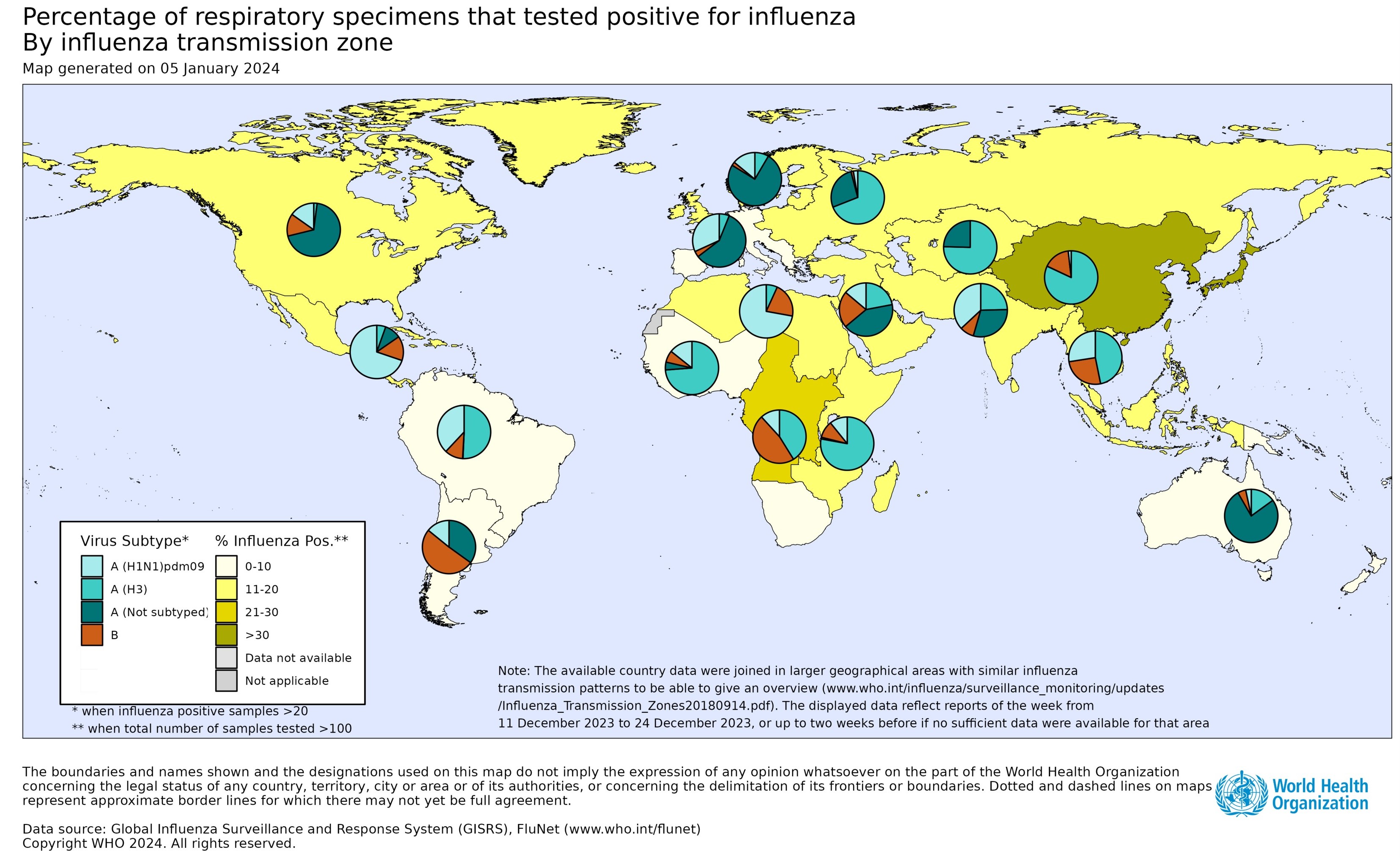 - National Influenza Centres (NICs) and other national influenza laboratories from 117 countries, areas or territories reported data to FluNet for the time period from 11 to 24 December 2023 (data as of 05/01/2024 07:00:39 PM UTC). The WHO GISRS laboratories tested more than 585 784 specimens during that time period. 100 299 were positive for influenza viruses, of which 86 897 (86.6%) were typed as influenza A and 13 402 (13.4%) as influenza B. Of the sub-typed influenza A viruses, 11 109 (27.3%) were influenza A(H1N1)pdm09 and 29 546 (72.7%) were influenza A(H3N2). Of the type B viruses for which lineage was determined, all (7053) belonged to the B/Victoria lineage.