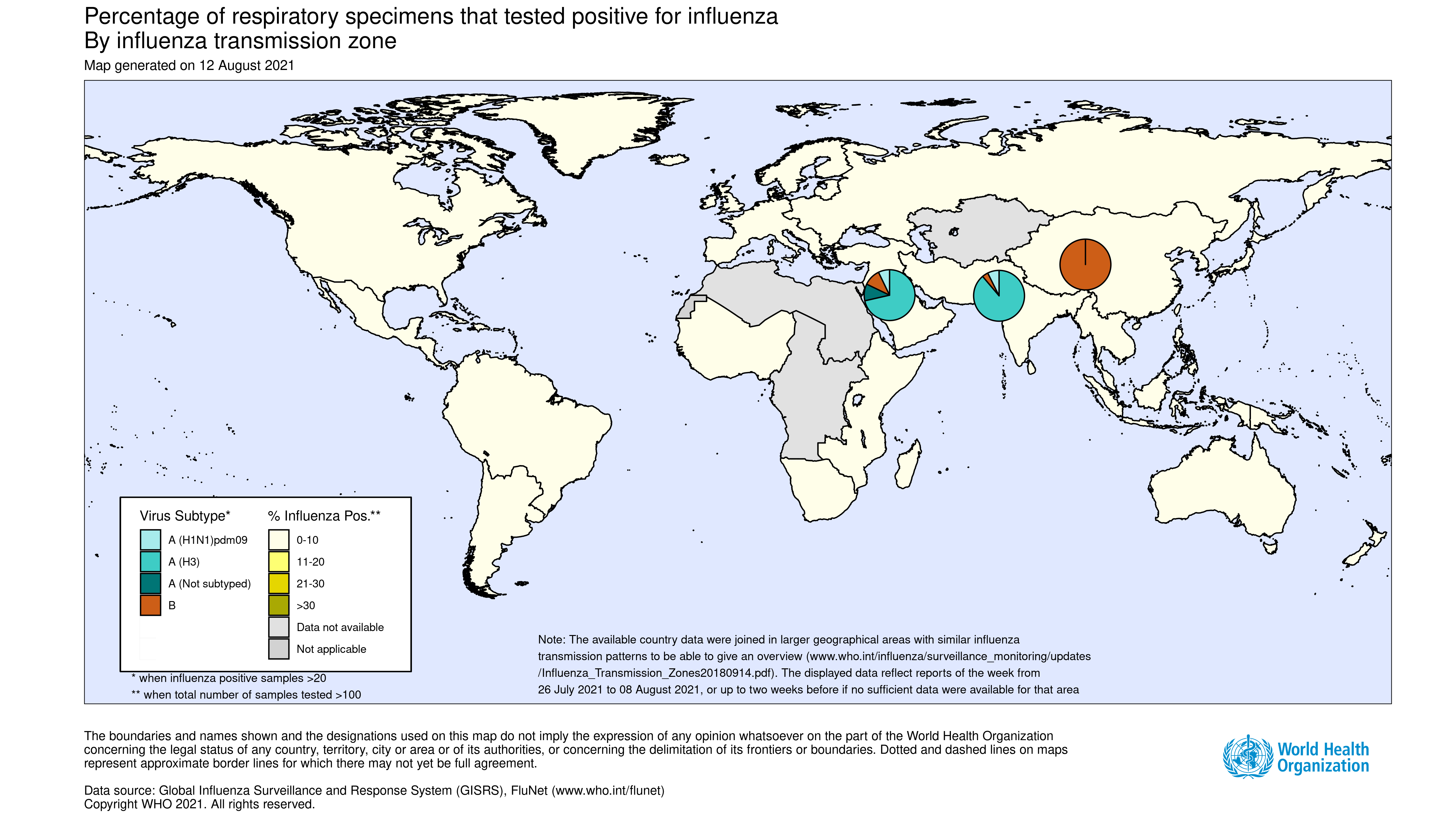 - National Influenza Centres (NICs) and other national influenza laboratories from 34 countries, areas or territories reported data to FluNet for the time period from six WHO regions (African Region: 1; Region of the Americas: 14; Eastern Mediterranean Region: 2; European Region: 10; South-East Asia Region: 3; Western Pacific Region: 4) reported to FluNet from sentinel surveillance sites for time period from 19 Jul 2021 to 01 Aug 2021* (data as of 2021-08-12 15:56:37 UTC). The WHO GISRS laboratories tested more than 118 519 sentinel specimens during that time period and 41 271 (34.8%) were positive for SARS-CoV-2. Additionally, more than 2 million non-sentinel or undefined reporting source samples were tested in the same period and 473 750 were positive for SARS-CoV-2. Further details are included at the end of this update.