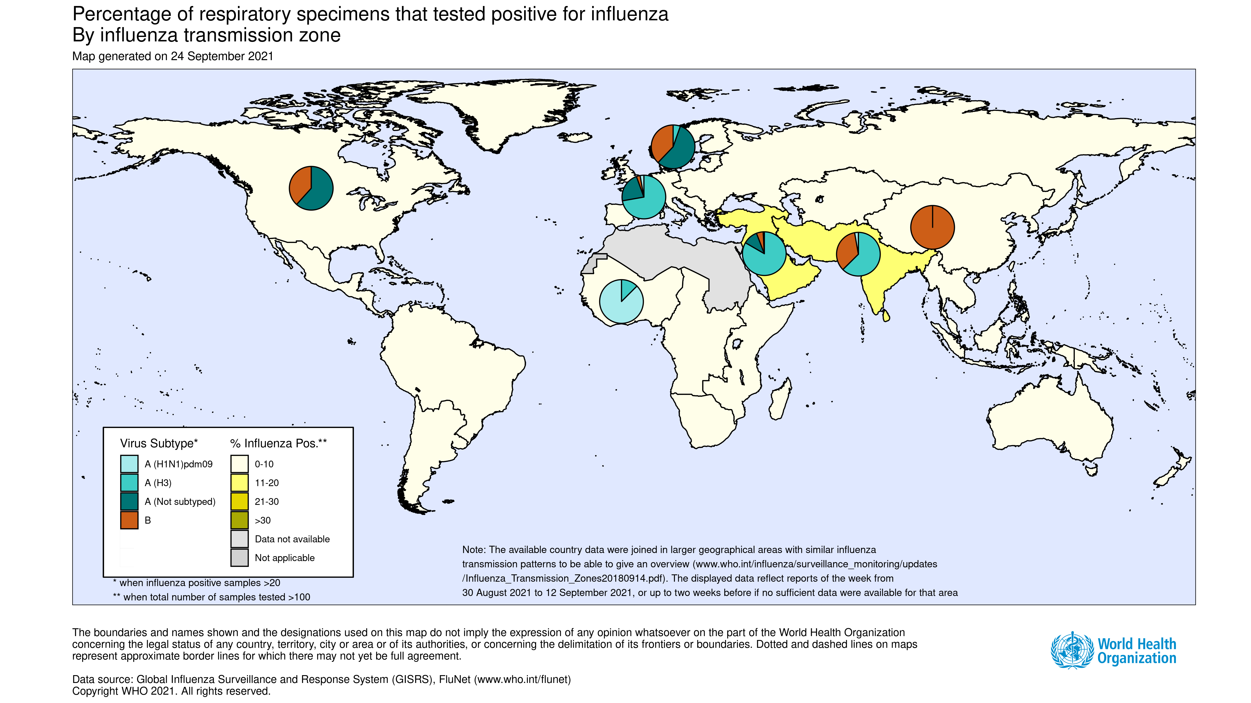 - National Influenza Centres (NICs) and other national influenza laboratories from 39 countries, areas or territories from six WHO regions (African Region: 1; Region of the Americas: 13; Eastern Mediterranean Region: 2; European Region: 14; South-East Asia Region: 4; Western Pacific Region: 5 ) reported to FluNet from sentinel surveillance sites for time period from 30 Aug 2021 to 12 Sep 2021 (data as of 2021-09-24 07:02:37 UTC). The WHO GISRS laboratories tested more than 85 300 sentinel specimens during that time period and 31 092 (36.5%) were positive for SARS-CoV-2. Additionally, approximately 2 million non-sentinel or undefined reporting source samples were tested in the same period and 211 892 were positive for SARS-CoV-2. Further details are included at the end of this update.